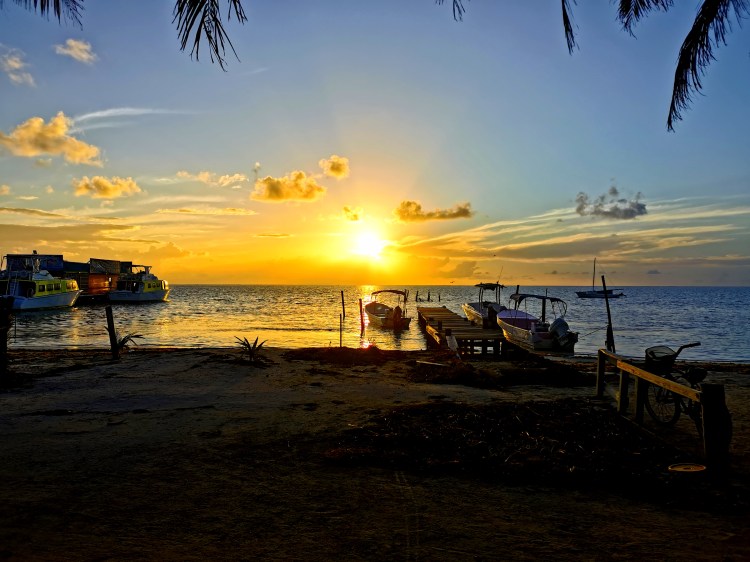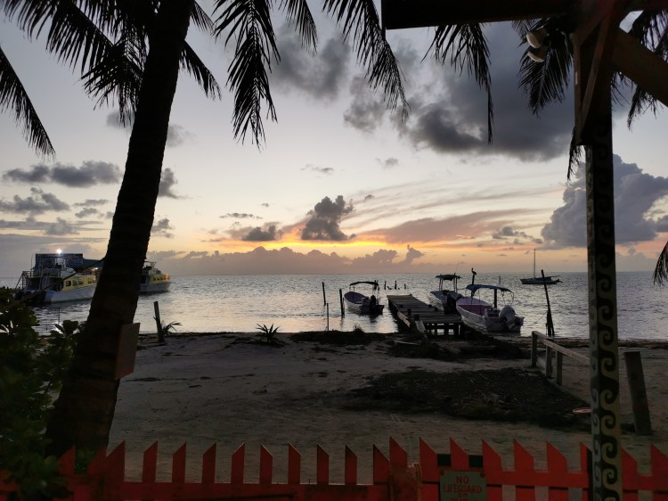 So ließ es sich super Aushalten. Dazu eine Menge Wasser und ab und zu mal was mit Schuss. Wir holten uns einen Snack zum Mittagessen, als sich eine Horde Jungs zwischen uns und das Meer setzte. Benehmen? Fehlanzeige! Mittags gegen 12 Uhr hielt der erste seine Hoden in den Cocktail, bevor sein Kumpel diesen auf Ex trinken sollte. Und wir wollten Essen… Der nächste kotzte 2 Minuten später neben sich auf den Boden – yummy. (er ging duschen und kam mit 2 neuen Drinks direkt zurück) Wir hatten dann auch die bristischen Soldaten mit ihren Kumpels von der walisischen Marine gefunden. Ein wahrer Traum! Nachdem wir unseren Snack beendet hatten, zogen wir um und suchten uns ein anderes Plätzchen in der Sonne. Malle 5.0 war dann doch nicht das, was ich für meinen letzten Tag brauchte. Katie und Constance hatten ihren Aufenthalt bereits verlängert und wollten von Caye Caulker aus weiter nach Flores, Guatemala. Für mich sollte es am nächsten Morgen zurück gehen. Also den Tag am Wasser ausgekostet und bevor es auf den Rückweg ging, natürlich noch einen schönen Abend mit Contance und Katie verbracht. Es ging erneut zum Swings und wir hatten ein paar Panty Ripper. Schon während wir auf das Essen warteten kamen die Jungs rein. Die Kombo aus Walisern und Briten… Noch bevor wir uns umsahen, saßen schon alle bei uns am Tisch. Gespielt wurde „ich hab noch nicht“ und beim ersten Drink erfuhren wir alles mögliche aus deren Sexualleben. Tranken taten Sie nach wie vor und Karaoke gab es ungefragt und mitten im Restaurant gratis dazu. Ein verrückter Abend! Zurück im Hostel wollte ich noch schnell mein Handy laden, aber im Zimmer waren die Steckdosen alle in Gebrauch. Also setzte ich mich mit Constance noch kurz nach draußen. Ohne Akku und ohne Tickets könnte ich meine Rückreise am nächsten Morgen knicken. Pläuschchen hin, Pläuschchen her – bekommt Constance eine Mitteilung, dass Guatemala die Grenzen schließt. Direkt und am nächsten Tag für alle Asiaten und Europäer. Die kleine Maus (21J.) völlig traurig. Hab ihr gesagt, sie soll zurück nach Mexico. Da hat es ihr die letzten Monate so gut gefallen und in Bacalar würde ja auch der Typ auf Sie warten. Apropos, der Typ… der wartete tatsächlich. Die beiden hatten nämlich, wie sich dann rauststellte, das Heck meines Auto kurzzeitig den Abend vor unserer Abreise Zweck entfremdet. 😉 Nach herzhaftem Gelächter und einem Absacker sind wir ins Bett, schließlich wollte Sie Morgens um 6 Uhr mit Aufstehen und mich zum Boot begleiten. Der Sonnenaufgang war wirklich schön.