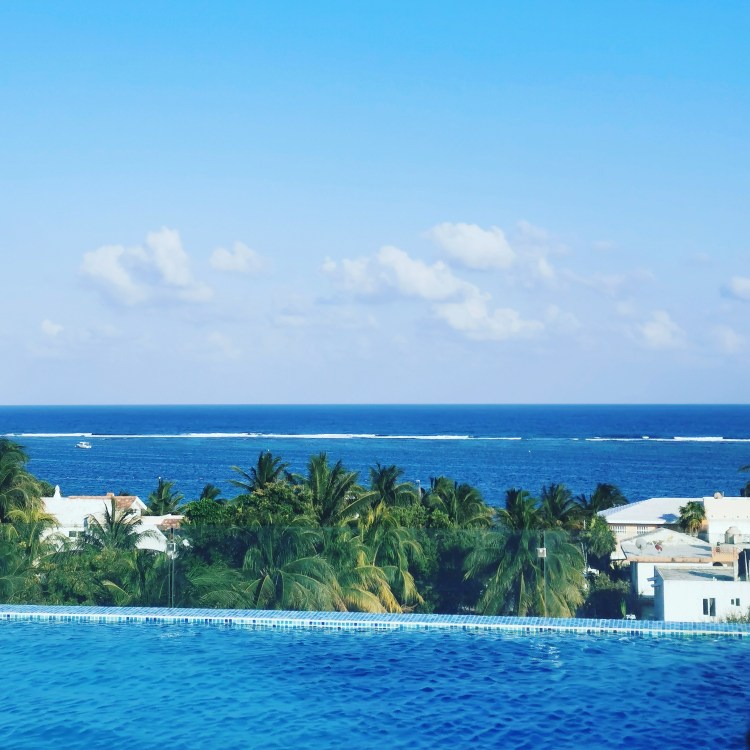 Da man auf einem Bein bekanntlich nicht stehen kann, gab es auch noch einen zweiten Cocktail. …und ein paar Bar Gespräche mit Luca. Der mir noch ein paar lustige stories aus Constance’s Aufenthalt berichtete. Später erhielt ich eine Einladung doch mit ihm nach Hause zu gehen… ich lehnte dankend ab. Ehrlich gesagt, wollte ich da einfach nur weg! Kurz geschlafen, ausgecheckt und ab zum Auto. Kein Frühstück, kein nichts. Ich musste weg. Da es für so ziemlich alles noch zu früh war (10 Uhr Morgens), musste ich mir erstmal eine Beschäftigung suchen. Es sollte nach Puerto Morelos gehen, aber laut booking.com kein check-in vor 14 Uhr. Dennoch konnte ich es nicht lassen und düste los. Auf zu einem hoffentlich netteren Ort und zu netteren Menschen, in ein schickes Zimmer. Gut ich war natürlich echt früh dort, gegen 12:30 Uhr. Mein Gepäck konnte ich zwar abstellen, aber eben vor 14 Uhr auf keinen Fall einchecken. Da ich noch nichts gegessen hatte, ging es erstmal brunchen. Während dessen telefonierte ich das erste mal nach 2,5 Wochen mit Zuhause. Merkwürdig bei 30 Grad im Schatten zu sitzen und die Stimme guter Freunde zu hören! Gut gestärkt machte ich mich auf den Weg zum Strand. Nur eben ohne Sonnencreme…die war im Storage vom Hotel gut verstaut. Dennoch, die Aussicht am Strand war super!
