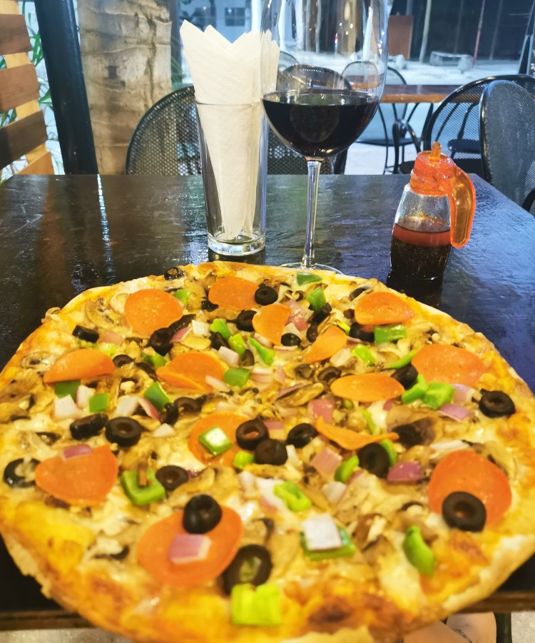 Hier ließ es sich auf alle Fälle super aushalten. Was für ein schöner Ausblick, um den letzte vollen Urlaubstag ausklingen zu lassen. Herrlich! Da in Mexico allerdings Feiertag war, hatten nicht alle Geschäfte geöffnet. Auch Abends blieben eine Menge der Restaurants zu. Ich fand dennoch eine kleine Pizzeria 10 Minuten Fußweg entfernt. Versuch Nummer 2 – Pizza. Diesmal wurde ich nicht enttäuschst! Die Pizza war super und der Rotwein ebenso! Außer mir, waren nur Senioren hier 🙂 Habe offensichtlich das Rentnerparadies erwischt. (war im ganzen Ort so) Aber gar nicht so ein schlechter Platz!