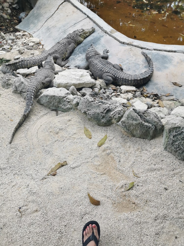 Nach einem zweiten Glas Wein ging es zurück ins Hotel. Dort in das schöne, saubere und große Zimmer mit dem 2x2m Bett. Ausschlafen 2.0 🙂 Gut ausgeruht und doch etwas aufgeregt vor dem Rückweg stand ich recht früh auf. Verließ das Hotel, besorgte mir eine Kleinigkeit im 7/11 oder hier OXXO und düste Richtung Cancún. Eine Nacht noch im NH Airport Hotel und Abflug – hoffentlich! Aber ich hatte Zeit und somit konnte ich noch etwas unternehmen. Google.maps und ich sind unterwegs immer dicke Kumpels und dort fand ich einen Zoo. Hauptsächlich mit Krokodilen – Super! Dies lag circa auf halber Strecke zwischen Puerto Morelos und Cancún.