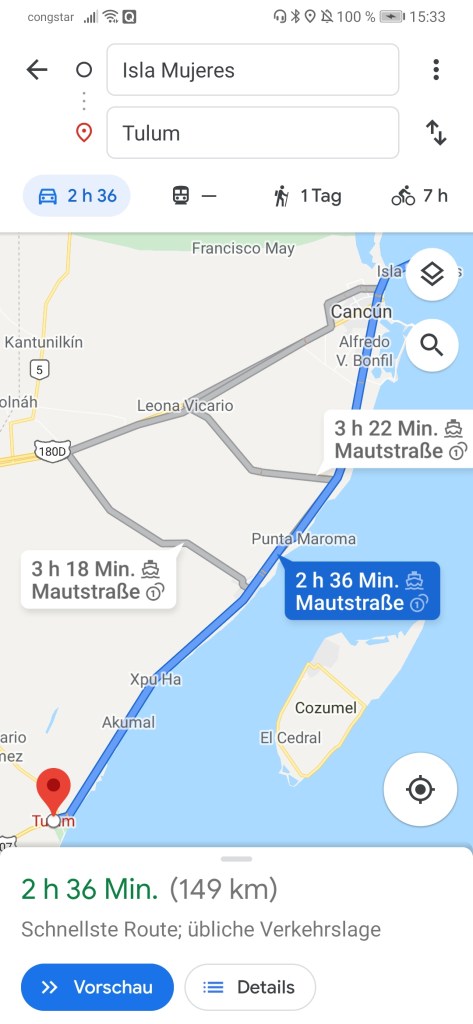Beside a lot of broken car pieces I made a new little friend. A cute little dog with many fleas. I just had to pet it. An hour later i got my car back. It was fixed. Happy af I made my way back to the car ferry Pier. Time to get back to the mainland. After another 2h on the ferry and a few hours drive i made it to Tulum. Google.maps is always very optimistic 🙂
