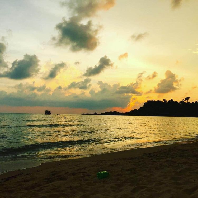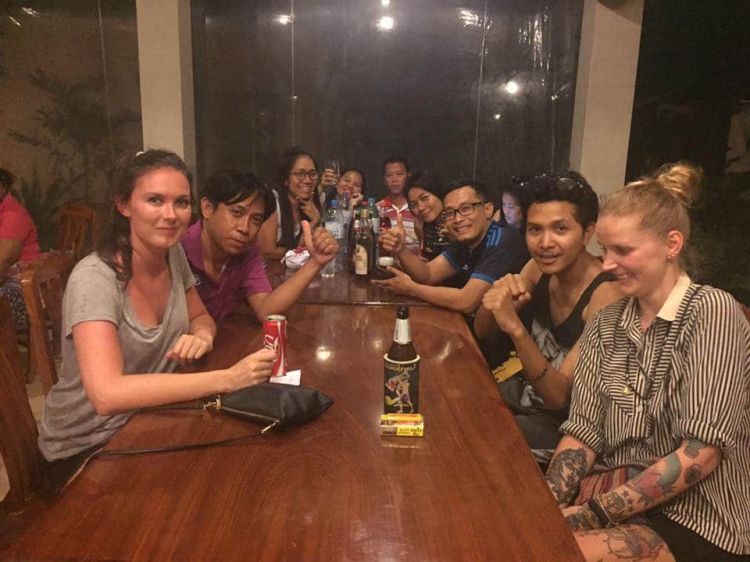 Das Hostel lag an der Hauptstraße, nur war dort weit und breit nichts, außer dem Obst- und Gemüseladen gegenüber. Der nächste Supermarkt war fußläufig nicht erreichbar, aber über den Strand konnte man Restaurants finden. Gesagt getan. Wie immer lernte ich schon vor meiner Nahrungssuche eine andere Touristin kennen und wir gingen zu zweit. Alleine essen macht einfach keinen Spaß. Wir saßen im Restaurant und genossen unser Abendessen, als wir neben uns am Nachbartisch eine Horde Thais entdeckten, die den Spaß ihres Lebens hatten. Wir kamen ins Gespräch. Kurze Zeit später fing es heftig an zu regnen. Alle rannten rein, wir auch. Neben der Gruppe Thais waren wir aber die einzigen Gäste, alle anderen waren zurück in den umliegenden Unterkünften. Aus zwei Tischen wurde ruckzuck ein großer und wir hatten einen super Abend! Es gab irgend einen billigen Thai Whiskey (hier gestreckt mit Wasser und Eis) und dazu Bier. Alle waren am Ende des Abends mau (betrunken/high) mak mak (sehr). Das beste aber war, die Thais sprachen kaum Englisch und das andere Mädel kein Wort Thai. Irgendwie ging es aber super und wir verstanden uns alle hervorragend!