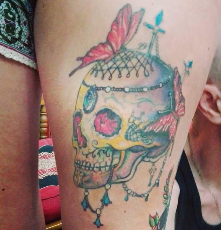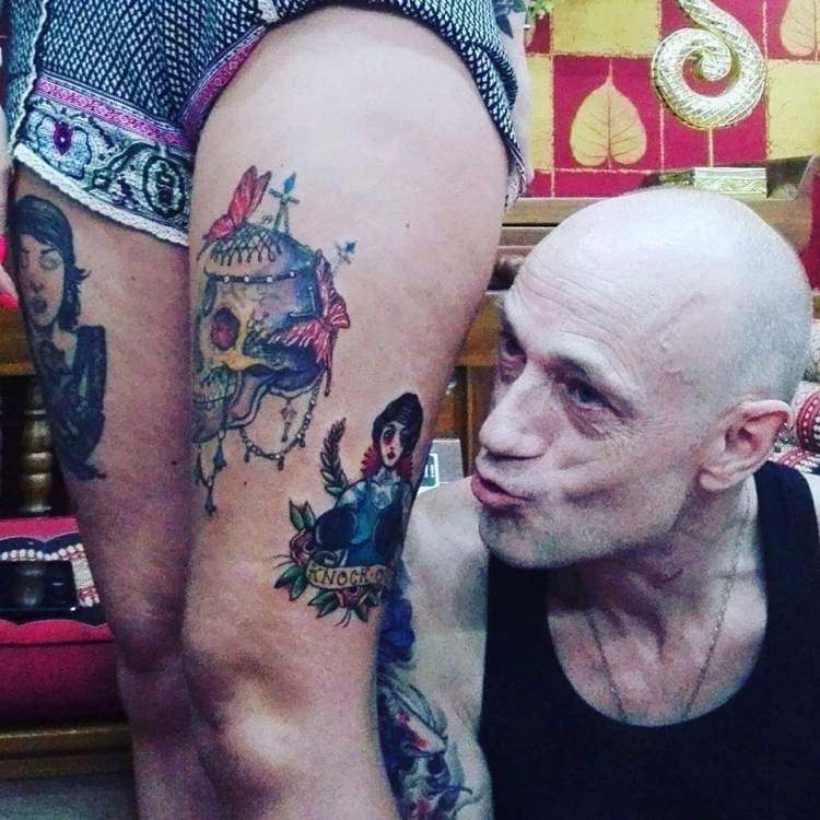 Natürlich durfte auch ein Tattoo nicht fehlen. Ich schaute mir ein paar wanna do’s von Frans an und entdeckte recht schnell meinen Favoriten. Auch wenn der neben ein paar Profi Stücken nicht ganz so perfekt ist, ist der Totenkopf für mich ein weiteres Highlight meiner Kollektion. Tätowiert wurde im Wohnzimmer/Flur/Eingangsbereich des kleinen Hauses. Hier gab es einen größeren Raum wenn man rein kam mit hinten liegender Küchenzeile und kleinem Bad daneben und ein Schlafzimmer im Untergeschoss. Die Luftfeuchtigkeit war so hoch, dass der Luftentfeuchter 24/7h lief. Zudem haben die beiden noch zwei Katzen, die auch überall rumliefen. Es war eben eher eine Jungs-WG, als eine fancy Designer Wohnung. Das machte die Herzlichkeit und Gastfreundschaft aber in Sekundenschnelle wieder wett.