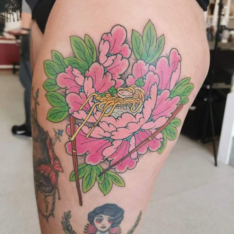 Nach einem ordentlichen Frühstück ging es den nächsten Tag dann auch schon zu Elliott. Elliott Wells hat einen ganz eigenen Stil und neben seinen Monstern ist er bekannt für seine Peonies. Zu Deutsch für seine Pfingstrosen. Meine beinhaltet dazu noch eine leckere asiatische Nudelsuppe.