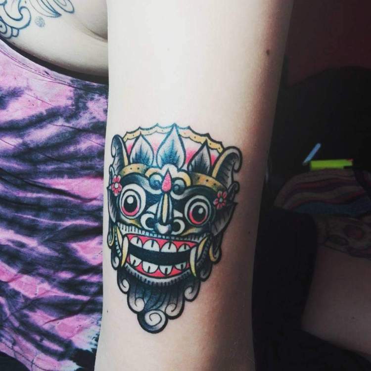 Die Barong Maske beschützt die Menschen, die Sie tragen. Wichtig ist bei den Tattoos, sie auf der oberen Körperhälfte zu tragen, erst dann bringt die Maske einem wirklich Glück. Durch Zufall hatte ich mega Glück und habe für meine Barong Maske schon vor der Info die richtige Stelle gewählt.