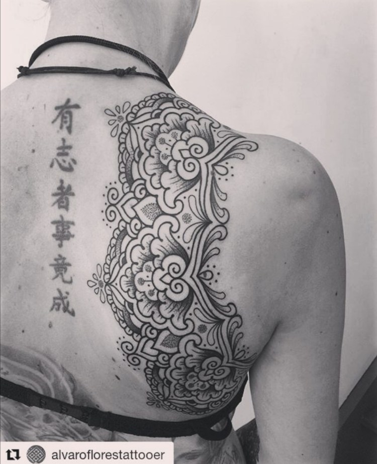 Die rechte Schulter verziert nun dieses Muster. Es passte super zu den uralten chinesischen Zeichen (genau, da steht Schweinefleisch süß sauer) und über die afrikanische Lady.