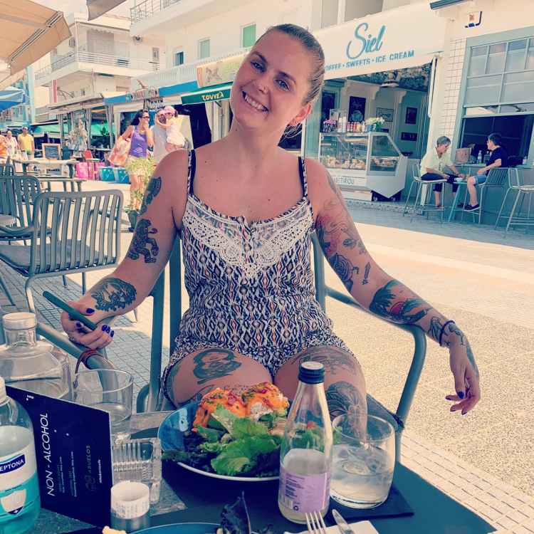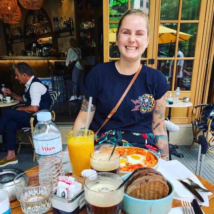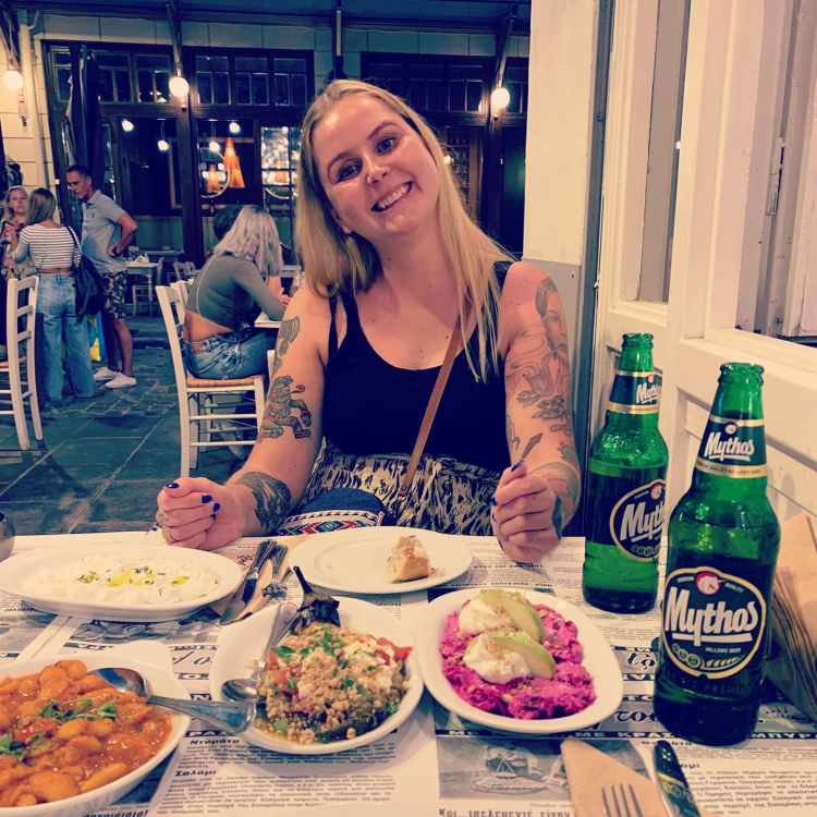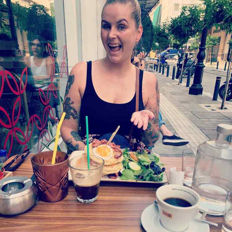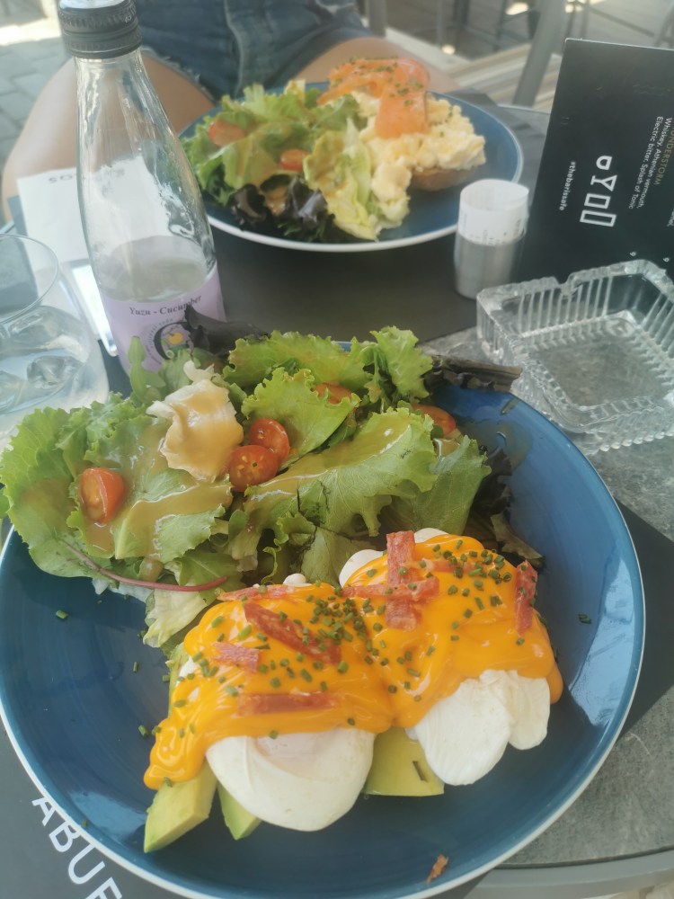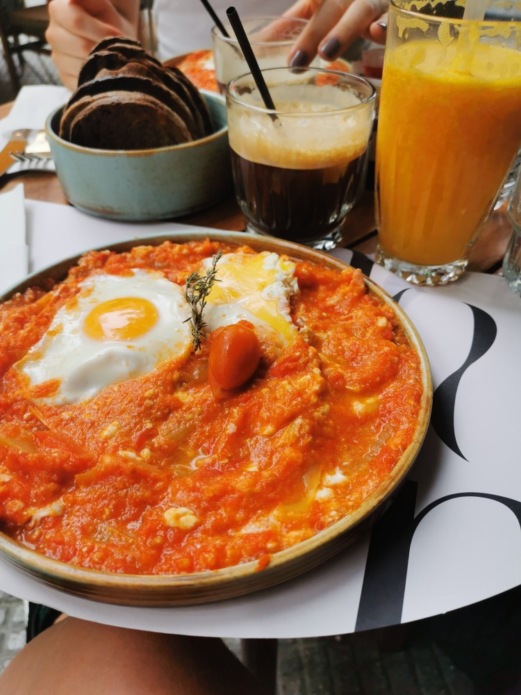 Da es bis zum Check-in aber noch dauerte, liefen wir auf der Suche nach Frühstück erstmal die Promenade entlang. Dort waren die Schicki Micki Läden, wir nannten Sie liebevoll erste Reihe Plätze. Wir passten dort nicht wirklich hin und fühlten uns mit dem Koffer am Arm auch eher etwas unwohl. In einer Seitenstraße fanden wir nachher das Noon, ein süßes Café. (auch wenn der eine Kellner etwas mürrisch guckte) Seine Kollegin war super nett und hilfsbereit. Da die Karte allerdings nicht so wirklich auf Englisch war und unser Griechisch nicht überzeugt, bekamen wir am Ende etwas unerwartet Shakshuka – Spiegeleier auf Tomaten – Zwiebel Ragout. Klar, wir beide hatten Bock auf Eier zum Frühstück…aber dachten eher an Rührei. Zu dem Shakshuka gab es frisches Brot und wir hatten beide einen Iced Espresso, ok ich on top einen frischen O-saft.