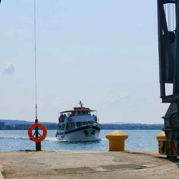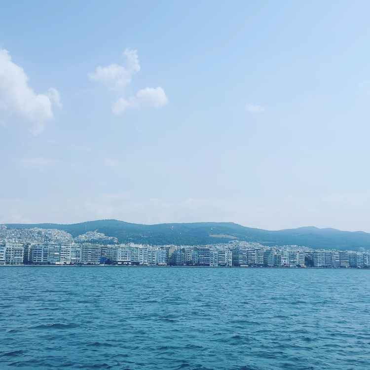 Als es Zeit für den Rückweg wurde, ließ uns das Boot einfach stehen. Es sei schon voll (richtig, halbvoll)… aber wir hätten mindestens 30min auf das wirklich letzte Boot warten müssen und es standen am Pier sicher 30 Leute. Wir entdeckten zwei junge Männer, die recht offensichtlich auch aus Deutschland stammten. Ich fragte, ob wir uns ein Taxi teilen mögen. Die Jungs waren dabei. Sie übernahmen die Suche nach dem Taxi und ich die Preisverhandlungen. 25,00 Euro für alle 4 – perfekt. Das Boot kostete 5,00 Euro pro Person. Benötigte länger, war unkomfortabler und quasi derselbe Preis. Nur die Aussicht vom Boot ist eindeutig besser – hier der Blick auf Thessaloniki.