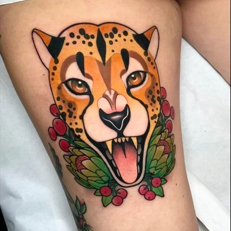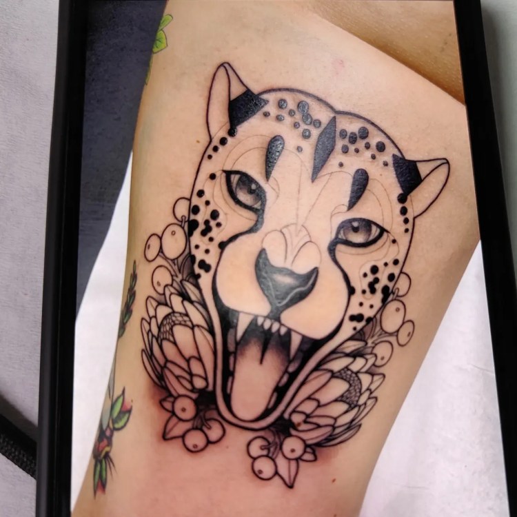 Für mich war dieses Tattoo gleich aus mehreren Gründen etwas ganz besonderes. Zum einen folge ich Debora seit Jahren auf Social Media, oder treffe Sie auf Conventions und bewundere wirklich ihre Kunst / ihr Handwerk, zum anderen wollte ich seit meiner Zeit in Südafrika damals einen Geparden tätowiert bekommen und habe über 10 Jahre nach einem passenden Künstler gesucht und drittens war es die letzte große Fläche, die ich tätowiert haben wollte. (Stand heute – für alle die, die mich gerne darauf festnageln würde keine weiteren bunten Bilder zu sammeln)