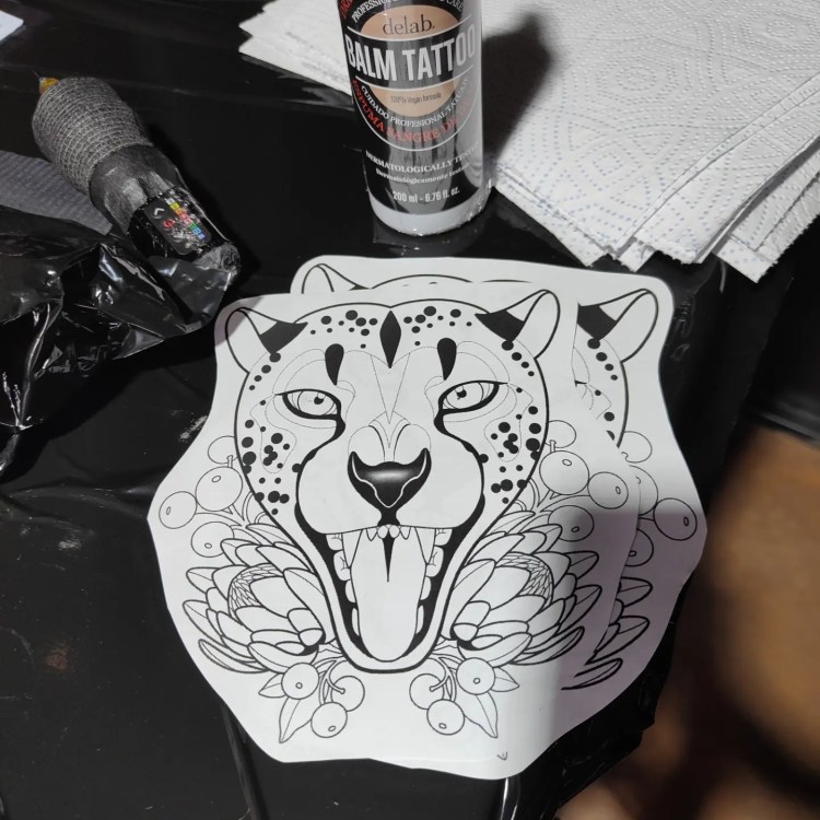 Der linke Oberschenkel ist nun mit einem wunderschönen Geparden verziert. All das leiden hat sich gelohnt! Zudem bekam ich von Debora sogar noch Geschenke! Eine Creme für die Nachsorge und ihren allerliebsten Druck eines Ihrer Bilder.