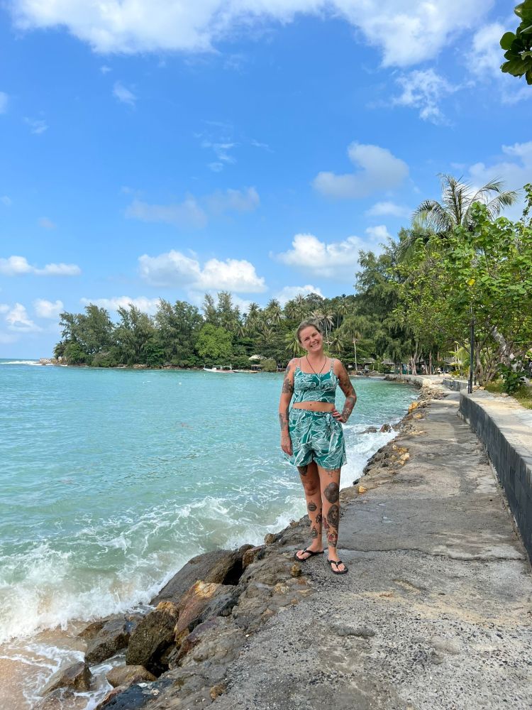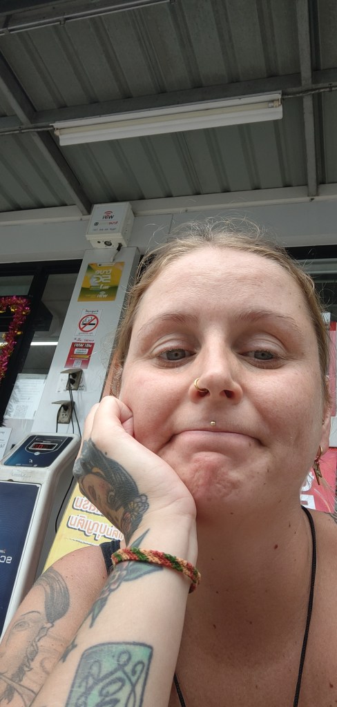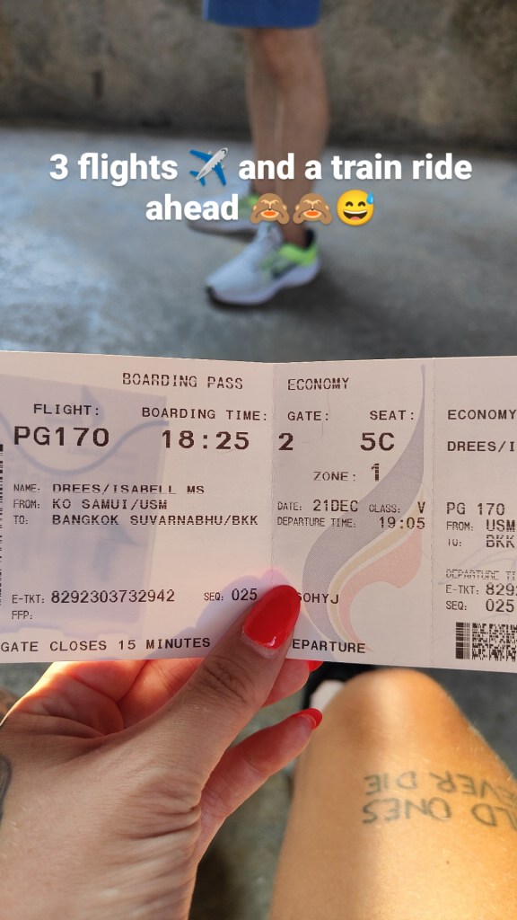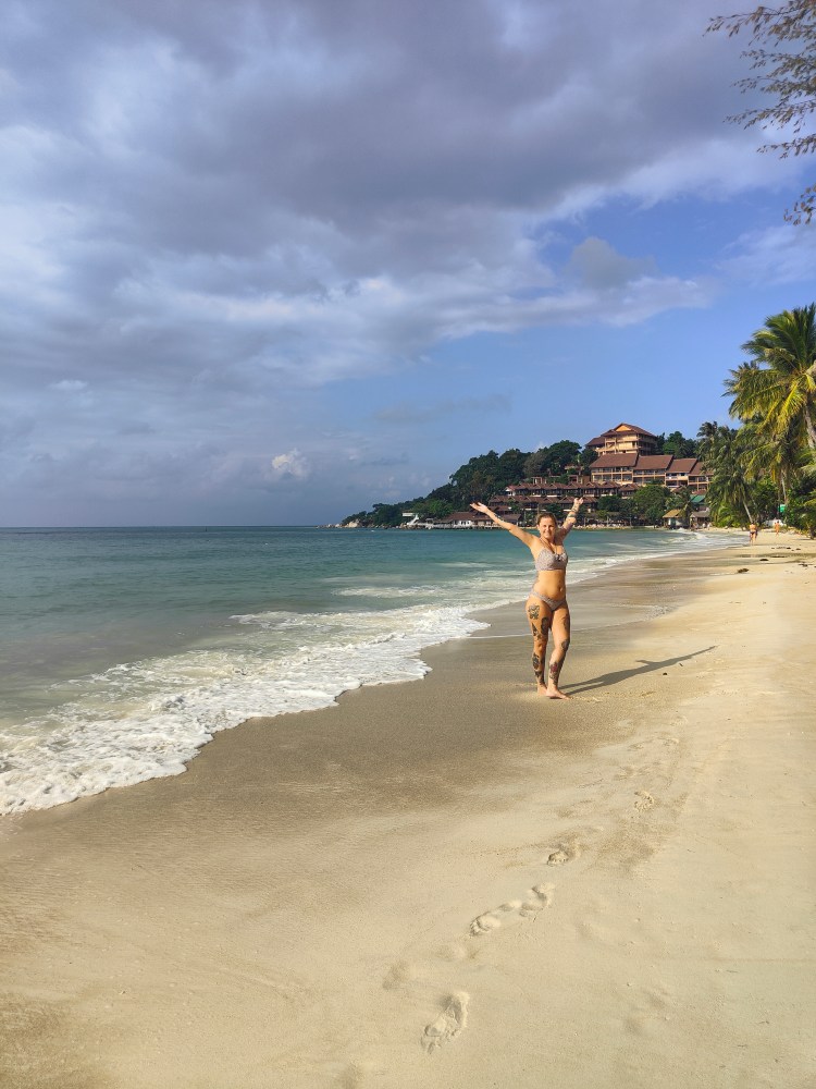 Das Foto was er geschickt bekam, wo ich denn gerade sei. Mein Gesichtsausdruck spricht, glaube ich, für sich. Ich bin super müde, hatte eine kurze Nacht. Gleichzeitig war ich in dem Moment wahnsinnig dankbar und glücklich für die unglaubliche Zeit, die ich (mal wieder) in Thailand hatte, happy noch einmal den Strand zu sehen und zu fühlen. Ich freute mich auch darauf die Chance zu haben, ihm gleich nochmal richtig Tschüss sagen zu können und doch schwang bei all dem ein kleines bisschen Wehmut mit.
