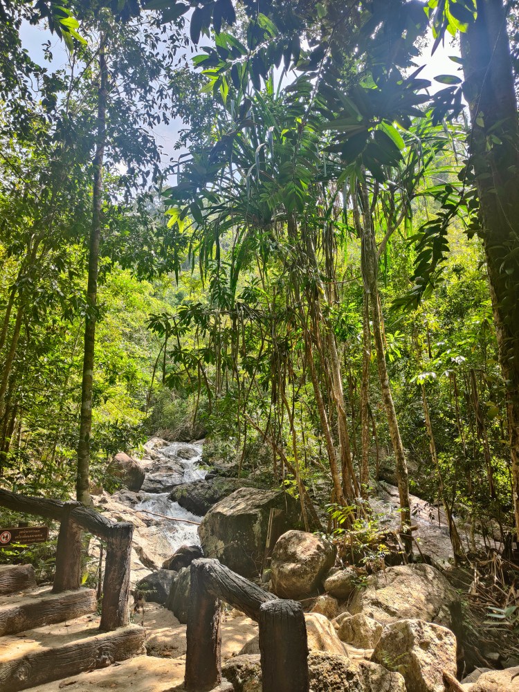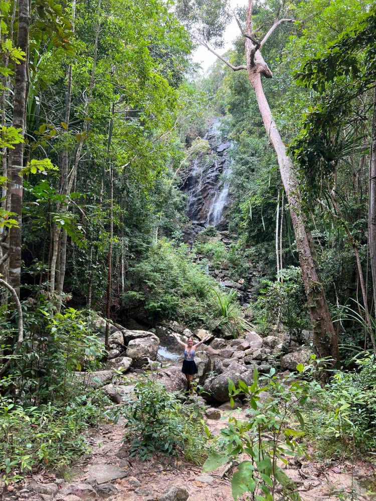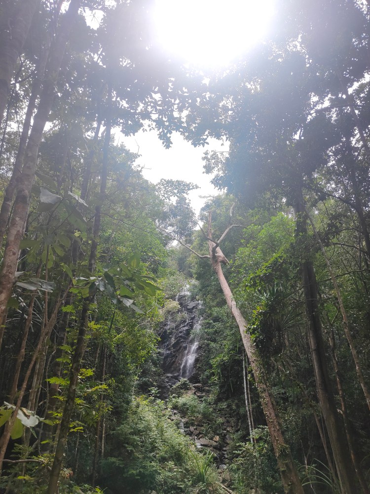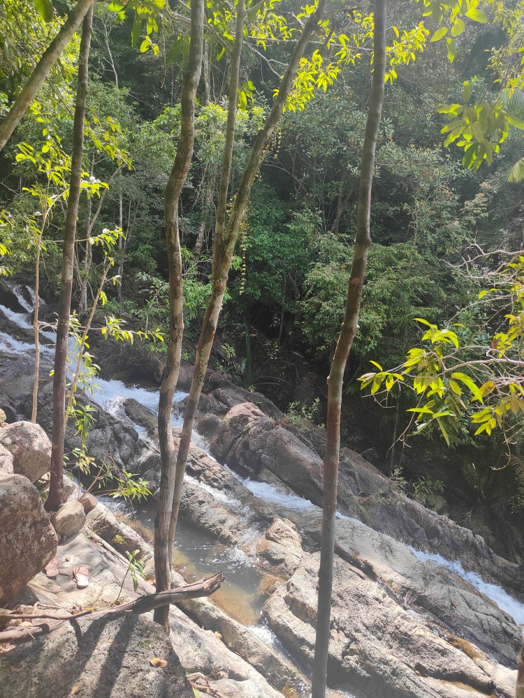 Wir traten den Rückweg an und erreichten nach einer knappen Stunde unseren Roller. Natürlich war das Eden nicht genug Natur für einen Tag, also cruisten wir weiter über die Insel. Durch die Natur, über Straßen links uns rechts gesäumt von Palmen, vorbei an einem Herrn, der sein Äffchen auf dem Roller durch die Gegen fuhr, zu Wasserfall Nummer 4. Es stand bereits im Netz, dass man irgendwo im nirgendwo parken müsse. Es war auch nichts wirklich ausgeschildert, wozu auch. Auch wenn unten auf dem Parkplatz Roller standen und drum herum ein paar einfache Unterkünfte standen, sah die Gegend hier nicht sehr erschlossen aus. Es ging einen steilen Hügel aus Sand und Schotter hinauf, der für mich in meinen „Bergsteiger Flip Flops“ bereits eine mittelschwere Herausforderung darstellte. Nach bergauf ging es dann irgendwo mitten in den Dschungel. Hier aber ohne ein Seil zum Weg weisen und festhalten. Ich sagte noch zu Eden „ich denke ich sollte wirklich warten“… tat es aber nicht. Wir kletterten weiter und ich vermutete schon ein paar Echsen und Schlange unterwegs, die wir aber nicht sahen. (die lebten hier ganz sicher und sahen uns durchaus) Ein wenig später sahen wir keinen unfassbar spektakulären Wasserfall, aber einen kleinen mit einer herrlichen Lagune!