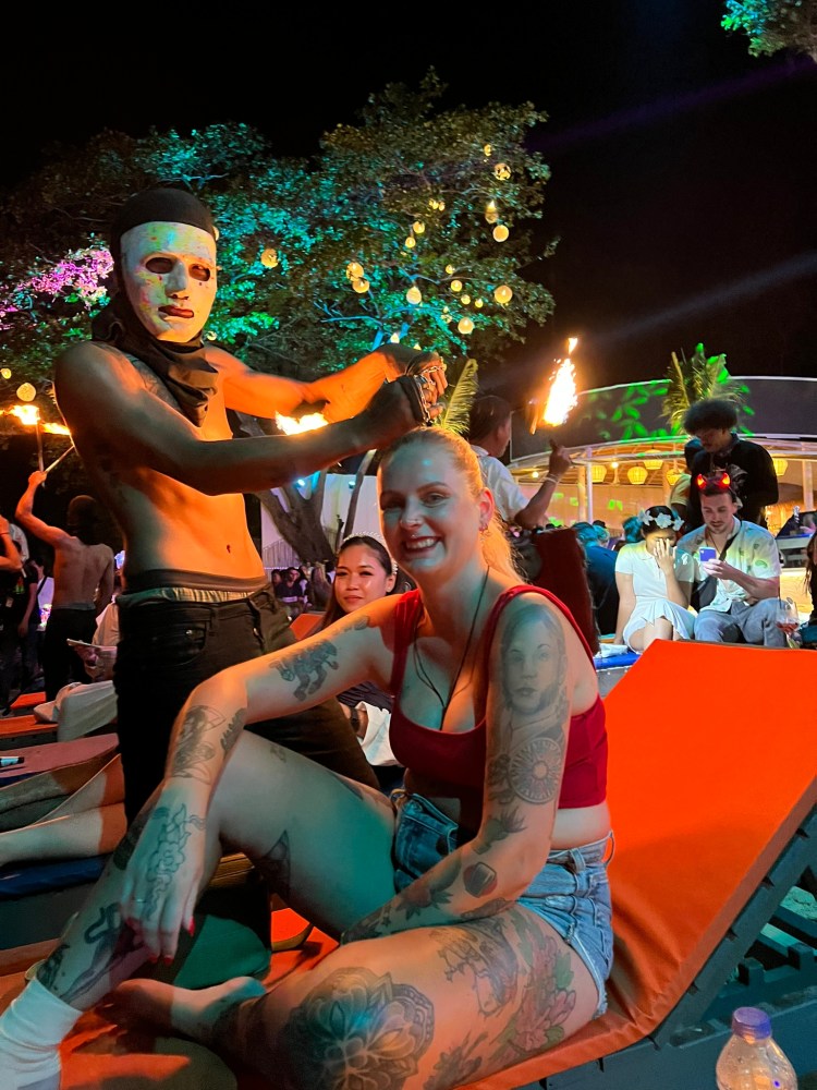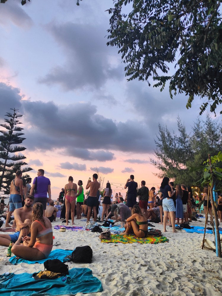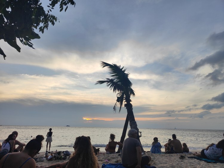 Wenn man, trotz Schmerzen, noch lachen kann… Da ich den Tag an einem Strand ausklingen lassen wollte und gleichzeitig ein Bier brauchte, düsten wir zum Zen Beach. Die die ihn kennen – ich brauche nichts sagen! Für alle anderen: der Zen Beach ist DER Hippie Strand der Insel. Alle kommen hier hin, um den Sonnenuntergang zu schauen, die die das Hippie Leben leben, Yogis, Gurus, solche die die passenden Instrumente spielen, es ist wirklich ein komplett anderer vibe!