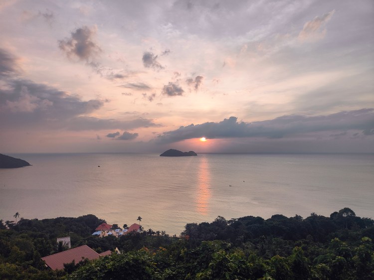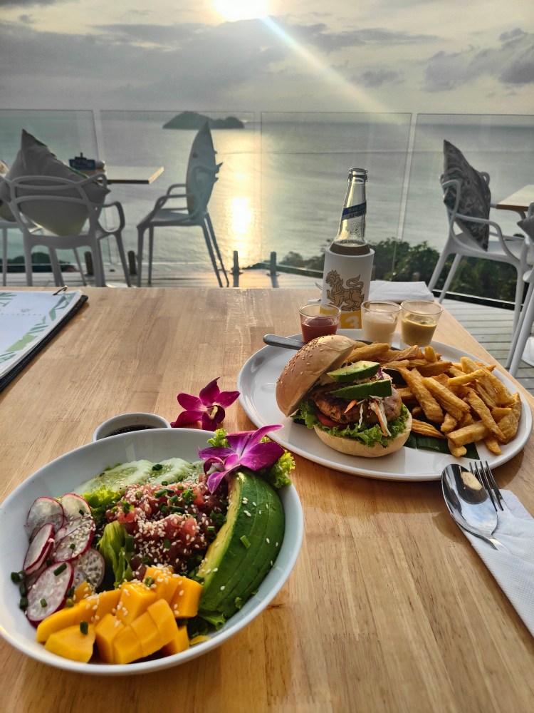 Eden wollte den Sonnenuntergang unbedingt im Bluerama sehen. Hierfür zahlt man dann aber auch mal eben 1000 baht „Eintritt“, sind ca. 27,50 Euro. Also so viel, wie wir beide zusammen für eine Nacht in dem Hotel bezahlten. Ich finde das für „ein bisschen“ Aussicht absolute Verschwendung, aber wie das beim zusammen Reisen so ist, man findet Kompromisse. Die 1000 baht kann man aber verzehren. Sie reichten jeweils für ein Bier und ein Essen. Das Essen war lecker und die Aussicht tatsächlich besser, als ich erwartet hatte. Also auch wenn ich sonst gerne das Geld mit vollen Händen ausgebe, bin ich in Thailand die lokalen Preise gewöhnt und dann fällt es mir schwer an so Touri Orten bewusst zu viel zu zahlen. Aber schaut selbst, es hat sich gelohnt.