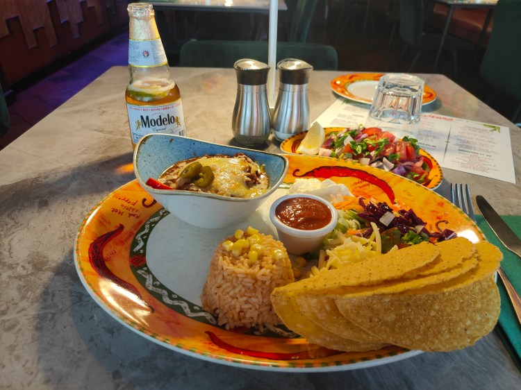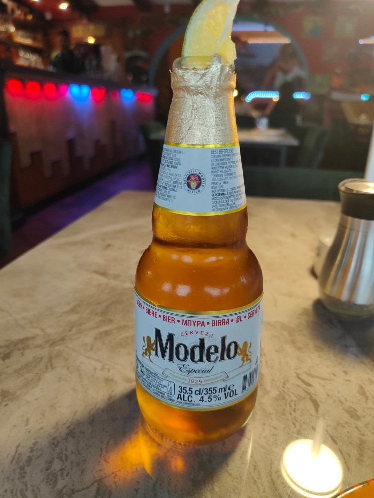 Ich startete mit einem Modelo, einem meiner Lieblingsbiere aus Mexiko. Dann gab es Beef Tacos mit lauter Extras und zum Dessert einen Erdbeer Margarita.