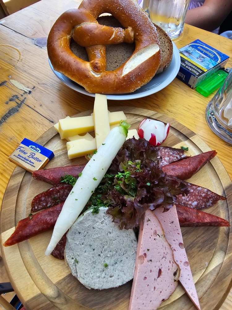 Wie man sieht bin ich irgendwann von Radler auf Bier und von den halben auf Mass gewechselt. Ups! 🙂 Um das aufzufangen gab es für Alex und mich natürlich auch nochmal was zu essen. Eine Brotzeit…