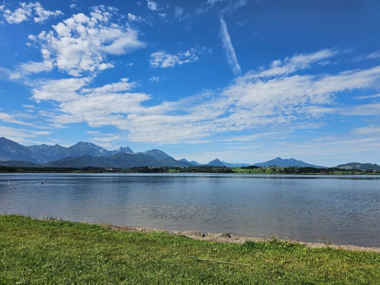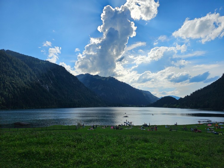 Der nächste Morgen startete mit allen, die bei Alex Papa geschlafen hatten und einem ordentlichen Katerfrühstück. Ewald machte jedem, der wollte, Rühreier mit Speck. Dazu Semmeln (Brötchen) und natürlich frische Brezen. Also alles, was man nach dem Feiern so braucht. Danach ging es für uns Hühner nach Österreich, in’s Tannheimer Tal. Klingt weit weg, ist es aber nicht. Man fährt 30-40 Minuten bis man dort ist. Quasi ein Katzensprung. Für mich der schönste See, den ich in den paar Tagen gesehen habe.