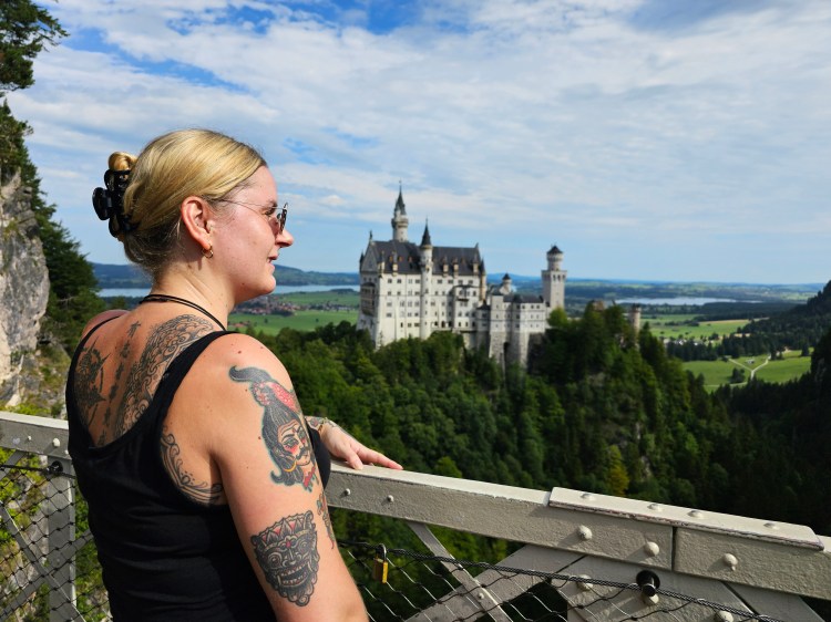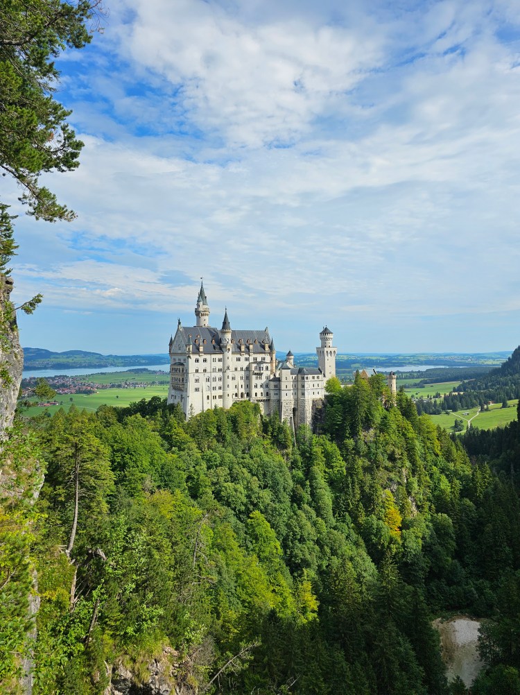 Der nächste Morgen begann sehr früh. Denn nun hieß es Sightseeing vom Besten! Ewald machte uns, wie jeden Morgen, ein leckeres Frühstück und für uns ging es ab Richtung Füssen. Zeit für das Schloss Neuschwanstein und die Burg Hohenschwangau. Alex hat mich ein bisschen veräppelt und mir erzählt der Aufstieg wäre locker machbar und ich würde maximal ein bisschen schwitzen… Bullshit! Also für faule Asthmatiker sind die 40-45 Minuten Aufstieg die Schotterpiste hoch mitten durch den Wald absolute Qual! Insbesondere bei 30 Grad… Klar es gibt Schatten und geübte Wanderer brauchen auch nur knapp 30 Minuten, aber ich brauchte ja auch die ein oder andere Verschnaufpause und einen Schluck Wasser hier oder da. Nichts desto trotz – oben angekommen ist der Ausblick herrlich! Es ist wunderschön.