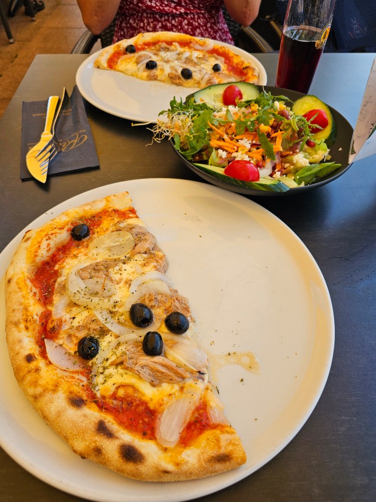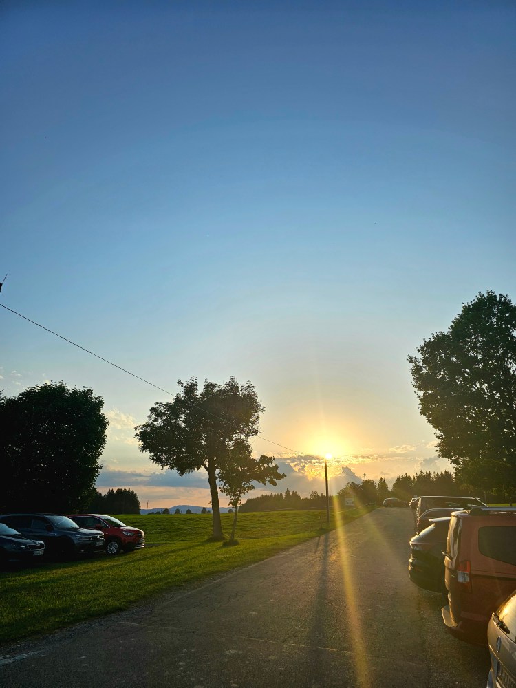 Oh mein Gott war das lecker. Ein rosa Braten vom örtlichen Jungbullen mit Röstzwiebeln und Spätzle. Hammer! Auch wenn die Portion wieder grenzwertig groß war, es gab vorab einen Salatteller, es war so lecker. Ich hab’s fast geschafft. Belohnt wurden wir mit einem herrlichen Sonnenuntergang.