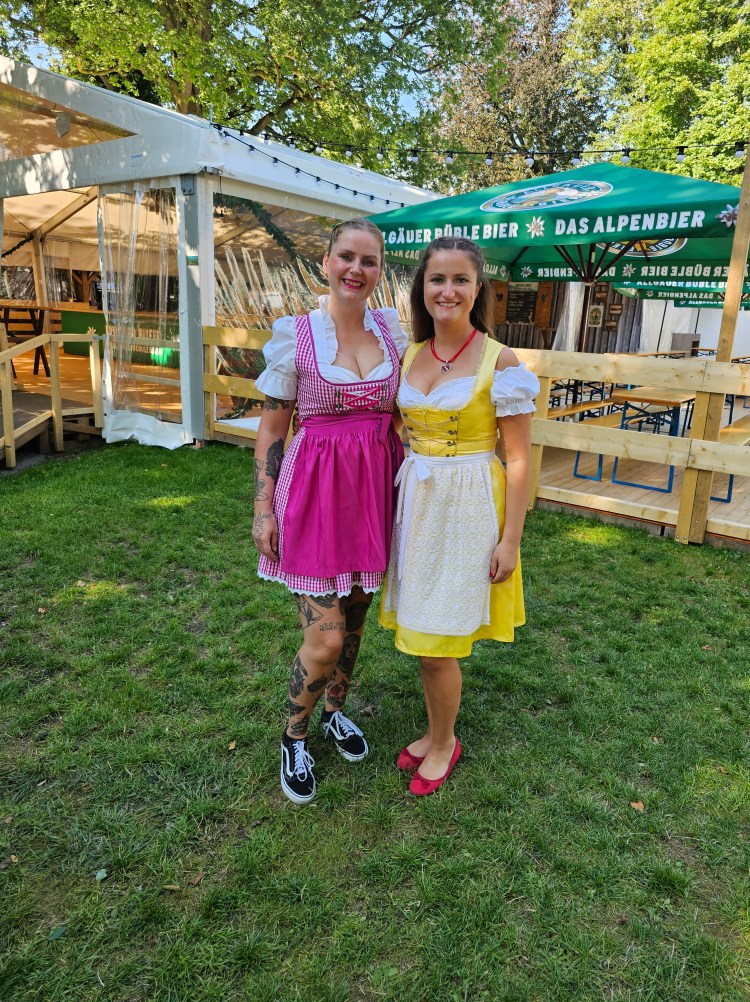 Nun war es endlich so weit. Samstag hieß es dann Tageseinsatz auf der Allgäuer Festwoche in Kempten. Alex Papa brachte uns gegen 10 Uhr Morgens zum Marktplatz in Kempten und wir starteten mit einem Wurstfrühstück auf dem Wochenmarkt. Es gab eine Auswahl aus verschiedenen Würsten. Weisswurst, Wiener Würstchen, Debreziner und noch eine ganze Reihe mehr. Dazu konnte man dann zwischen „normalem“ und süßem Senf wählen und jeder bekam eine Brezen dazu. Auch wenn wir insgesamt an dem Tag evtl. mehr hätten essen sollen, war dies der perfekte Start in den Tag. Da wir auf dem Markt vergeblich nach einer Bierbude suchten, ging es dann auch schon direkt rein in die Festwoche. Natürlich alle in Tracht. Hier ziehen wir Dirndl und Lederhose zu Karneval an, oder wenn wir mal Oktoberfest feiern…was aber so gar nichts mit dem echten Oktoberfest gemein hat. Dort ist es Tradition und wird ganz anders gelebt. Ein „ordentliches“ Dirndl besitze ich dennoch und dies trug ich auch am ersten Tag. Bei um die 30 Grad war es jedoch verdammt heiss in dem Teil.