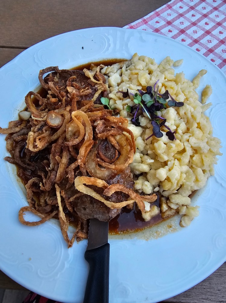 Ein „letztes Abendmahl“ gab es im Waldgasthaus Tobias, nicht weit von Alex‘ Elternhaus. Ich hatte zuvor mal von jemandem gehört, dass Zwiebelrostbraten sein Lieblingsgericht sei, hatte es aber noch auf keiner Speisekarte gesehen. Also fragte ich Alex irgendwann, ob sie das kennt „ja natürlich“. Also war klar, es ist ein bayrisches Gericht und ich musste es hier vor Ort probieren.