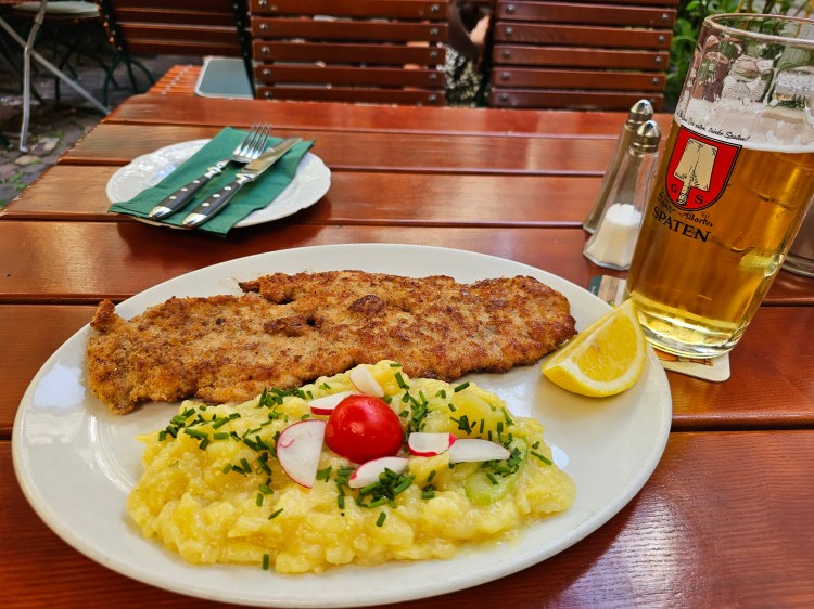 Es gab ein Schnitzel in einer Kruste aus Meerrettich und süßem Senf mit frischem Gurken-Kartoffelsalat. Leute ich verspreche euch es war das beste Schnitzel, dass ich in Jahren hatte! Auch preislich völlig in Ordnung. Zumal der „Teller“ hier eher die große Servierplatte ist. Gut gesättigt und mit der Handynummer von Armin, dem Kellner in seinen 50ern in der Tasche, verließ ich das Lokal. Ich sollte mich ruhig mal melden, wenn ich zufällig mal wieder in München wäre… Scherzkeks der Gute!