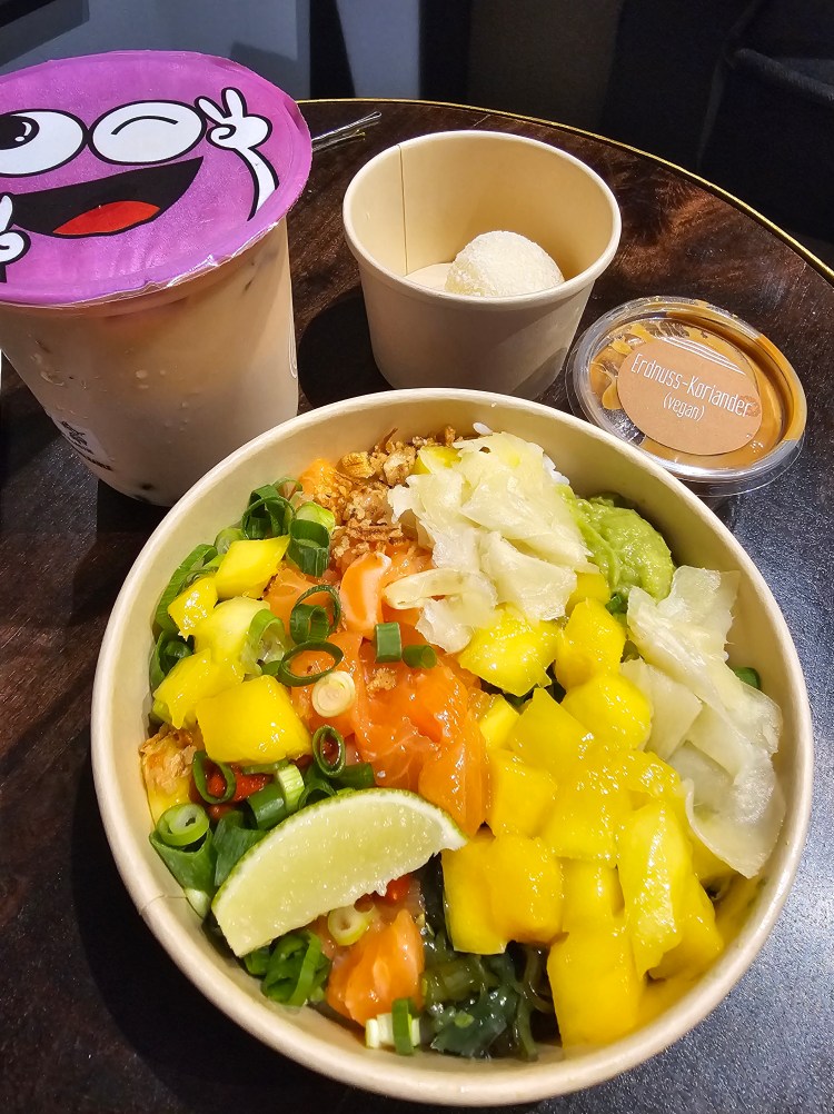 Ich gönnte mir ein letztes Abendmahl von Lieferando. Eine leckere Bowl, samt Mochi und mehr Bubble Tea.